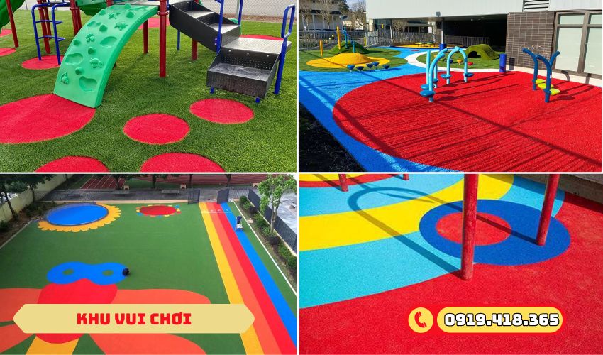3. Cỏ nhân tạo màu đỏ cho sân chơi trường học và khu vui chơi: Các khu vui chơi trẻ em, sân chơi trường học thường dùng cỏ nhân tạo màu đỏ 3cm độ bền cao, an toàn cho trẻ để tạo những khu vui chơi đa sắc màu, thu hút hoạt động của trẻ, đồng thời chúng bảo vệ trẻ khi chạy nhảy.